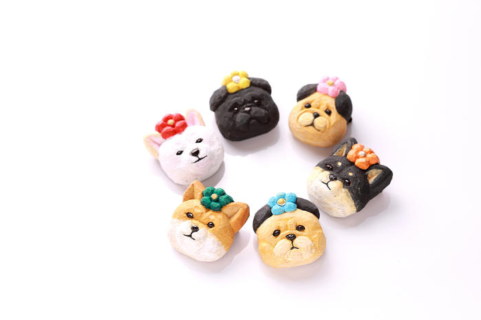 - ブローチは柴犬(茶・白・黒)、パグ(白・黒)の5種類と頭の上に乗せたお花の色を6種類からお選びいただけます。