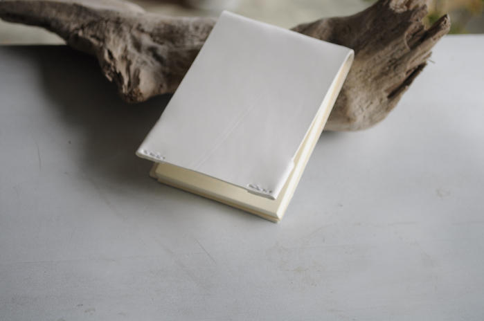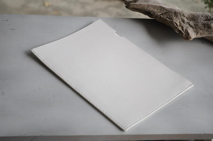 - 新しい革を見つけるとワクワクして、何を作ろうか想像します。今回出会った革はコーティングされすぎず自然の風合いを残した白い革。しっかりとした革なので、これでノートカバーやペンケースなど文房具を作りたいと思いました。