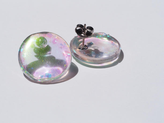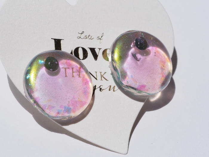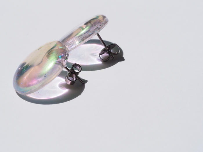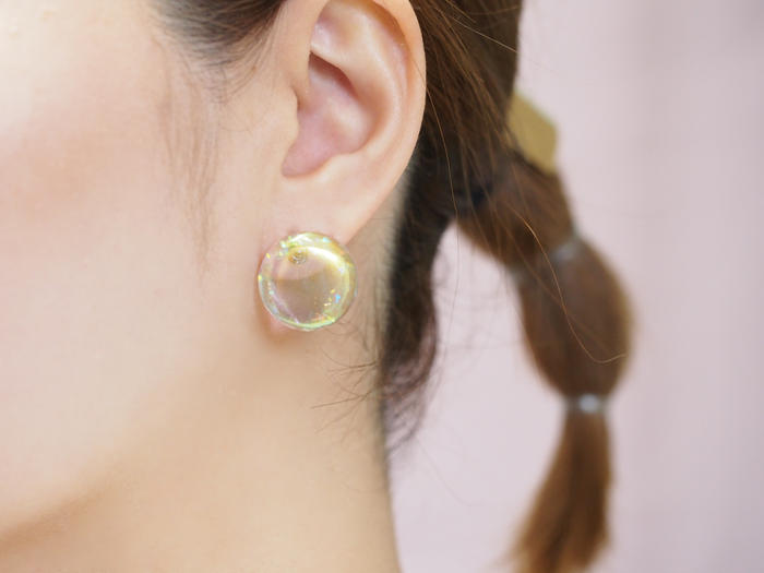 - オーロラカラーのラウンドデザイン。つける方を選ばずシンプルなデザインに仕上げました。つけ心地はとても軽く長時間つけていても耳が疲れません。透け感のあるデザインなのでコーデやヘアスタイルはどんなパターンにも合います。
