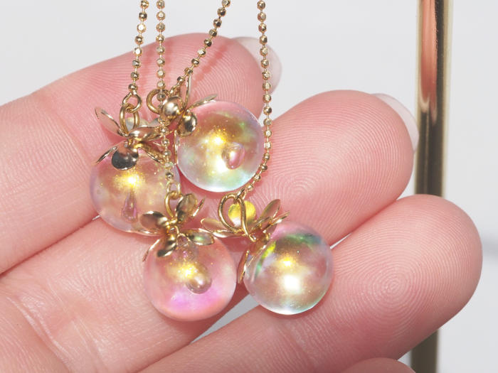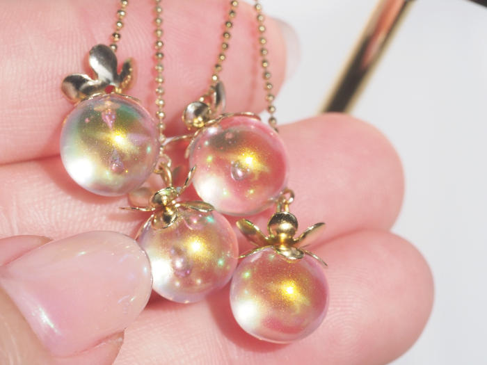 - 小さめのオーロラカラークリアパーツを2つ、チェーンで繋げました。まるでその様はサクランボのようでとても可愛らしいデザインです。