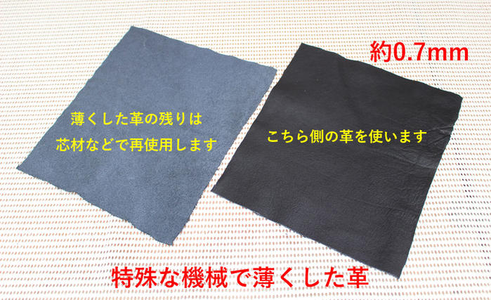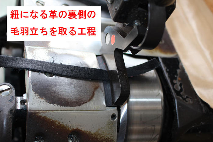- 毛羽立ちのある革は厚みがあり穴に通すことができないので革を薄くする機械で1本1本毛羽立ちを取る作業を行います。