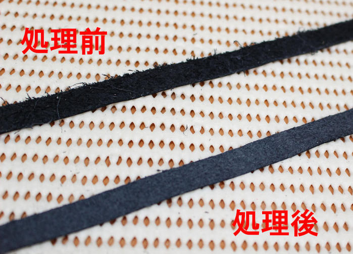 - 紐にする革を準備します。たいていの革の裏側は写真のように毛羽立ちがあります。