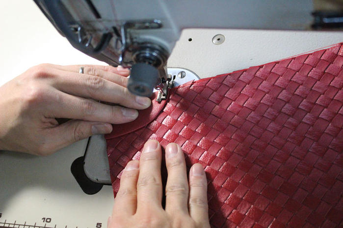 ソフト牛革メッシュ ポシェットの製造工程(一部)