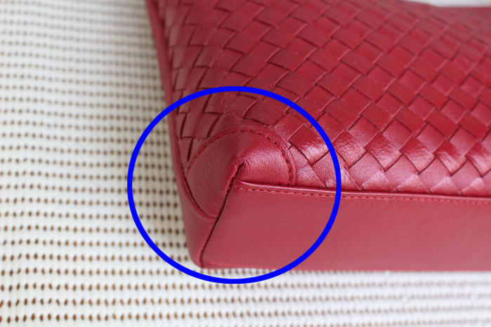 - 青丸で囲った部分を角ハギ(すみはぎ)と呼んでいます。手提げやポシェットとして持たれていて、この部分が一番物と接触する部分でダメージを少しでも和らげるために角ハギを付けています。