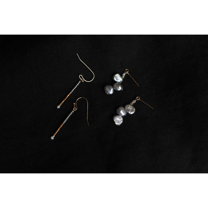 シルバーカラ―のクレオ穴(穴の位置が中心でない)パールを使用することで、可愛くなりすぎず程良く個性が光るデザインに仕上がりました。
