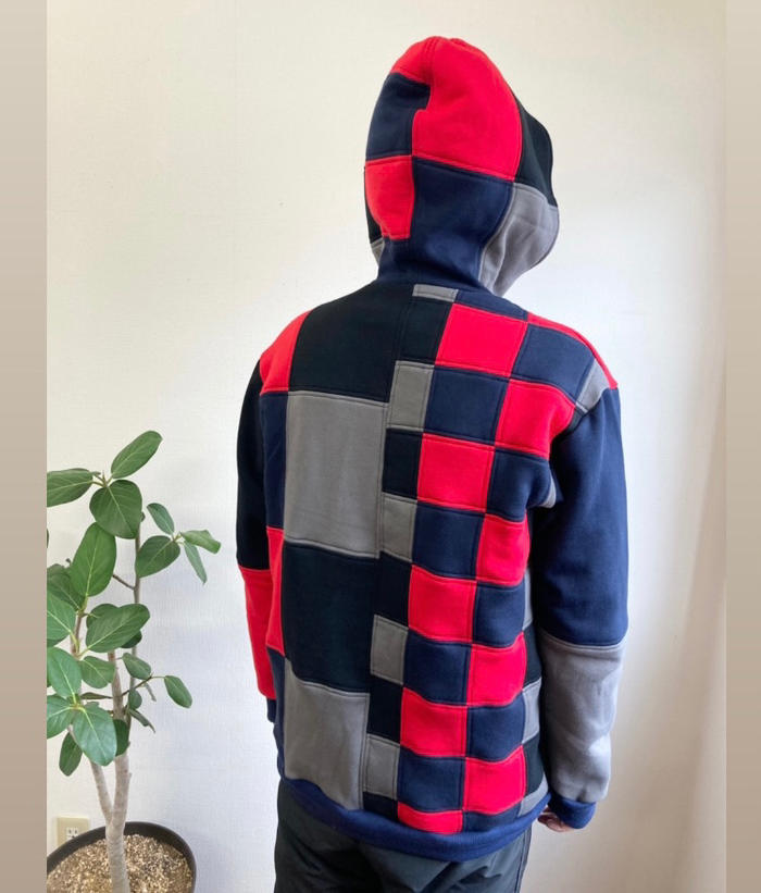 - 厚手のしっかりとしたコットン素材のトレーナーで裏起毛でふわふわしています。素材が厚手なので温かいです。デザインは定番のトレーナーで首がすこし立ち襟になっているフードのデザインです。手首、裾リブはネイビーです。左右の腕のデザインが違い、片側は市松模様です。後ろと前もデザインが施されていてどの角度からみても違うデザインで面白いです。