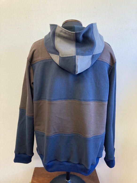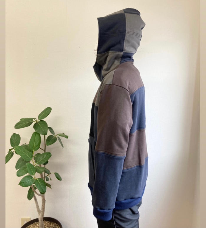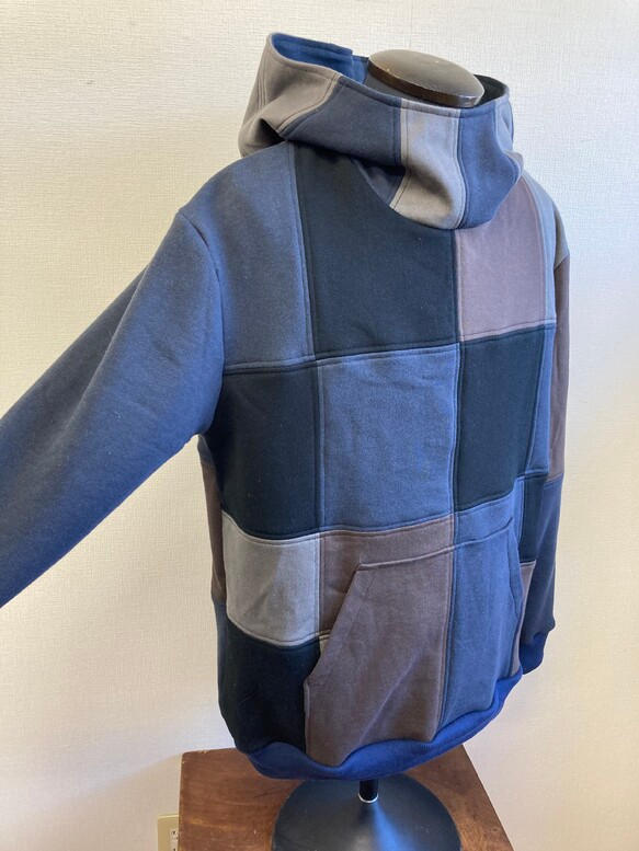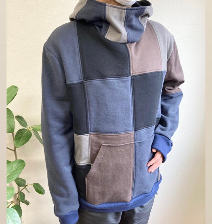 黒、紺色、グレー、茶のバイカラーで凝った組み合わせのパッチワーク風の市松模様やモザイク模様の凝ったデザインになっています。普通のパーカーの制作時間より3倍以上縫い時間かかるこだわりの仕上げた他にはない一点ものです。