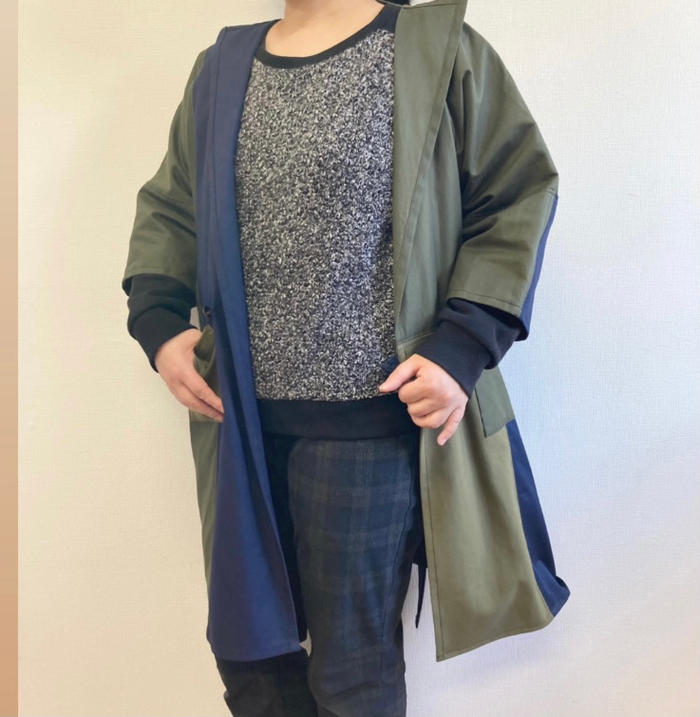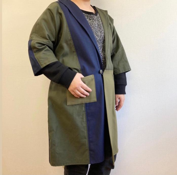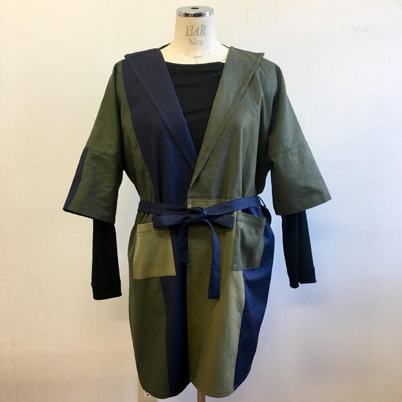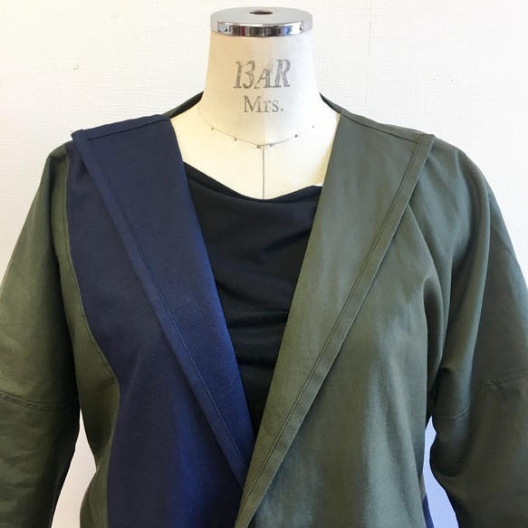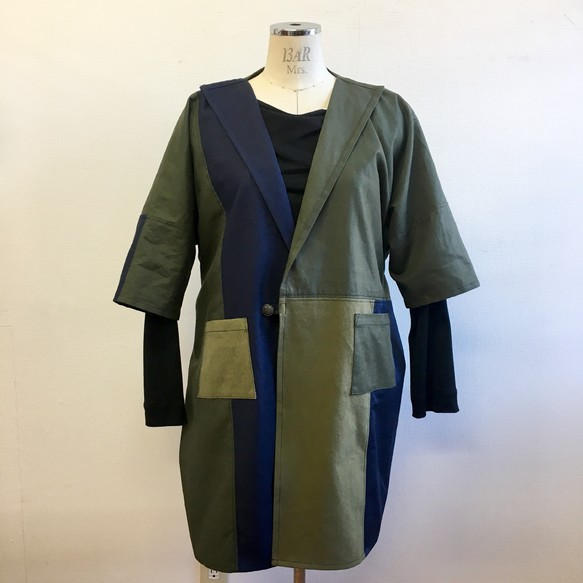 - つぎはぎのモザイクパッチワークみたいなデザインのバイカラージャケット。メンズレディース兼用のデザインです。素材はしっかり目のコットン素材でハリも少しあるのでカチッと着れながら軽さもある素材です。色味はカーキ、紺色のバイカラー濃淡がある色なので実際は4色くらいになっています。