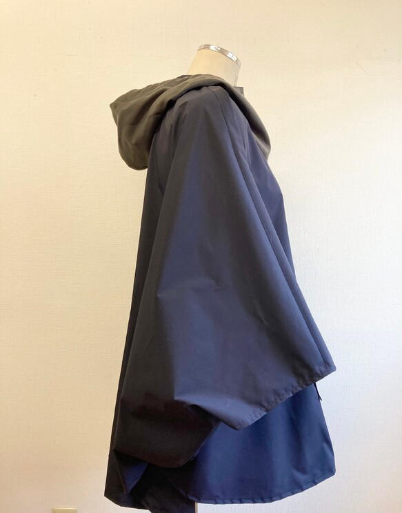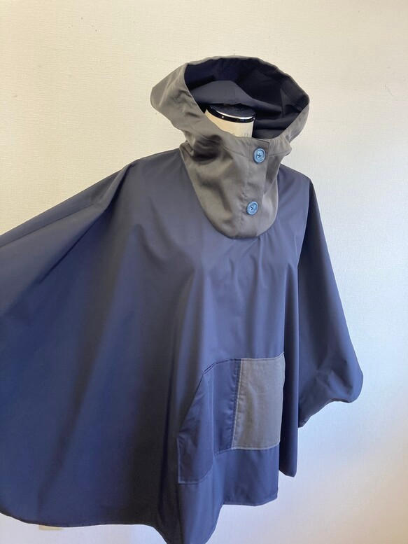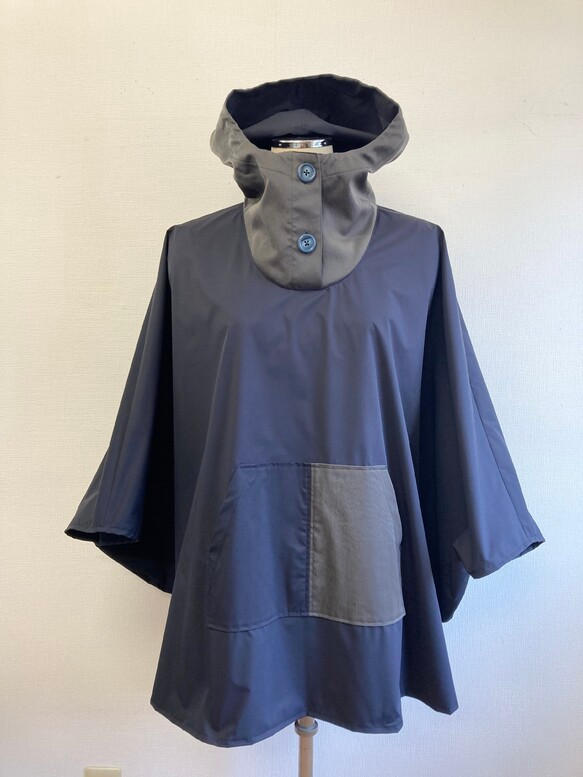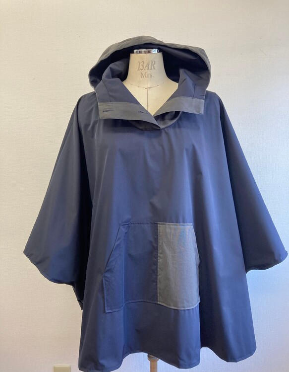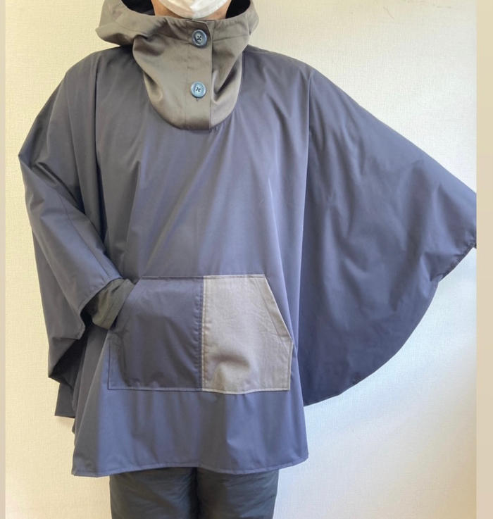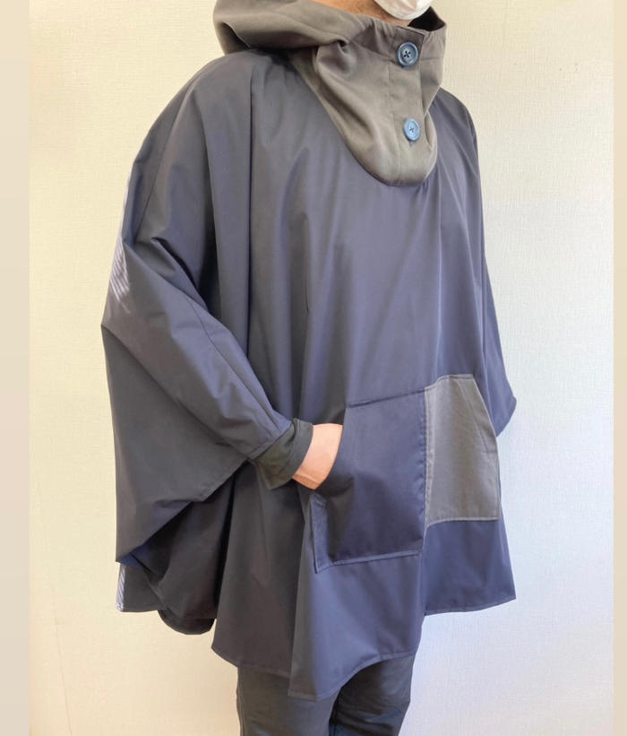 - キャンプにもオススメポンチョタイプのパーカージャケット。コットン、ポリエステルのシャカシャカした素材のネイビーとチャコールグレーのバイカラーの生地です。薄手でサラッとした手触りなので着心地も軽くて羽織やすいです。