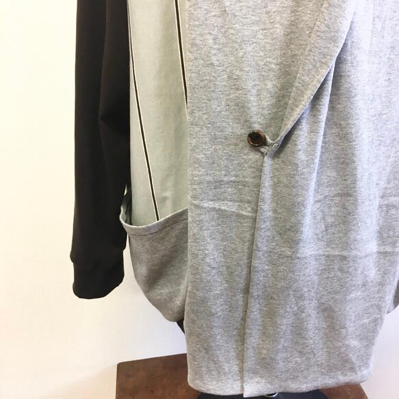 前にボタンが1つとまるデザインですが、前をかけて着るとIラインが協調されてスッキリと細身に羽織れると思います。ポケットはゆったりしたデザイン、薄手なのであまりものを入れすぎないよう注意して使ってもらえたらと思います。