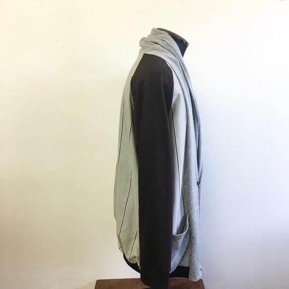形はラグラン袖でゆったりめ、身幅も前のガウン調の首のラインがドレープみたいにゆったりなるので幅広でとっても着やすいです。首にストールをかけているように首元がたっぷり布がかかるので首元が温かいです。男性サイズで作っていますので、女性が着るとお尻が隠れて長めカーディガンという感じです。