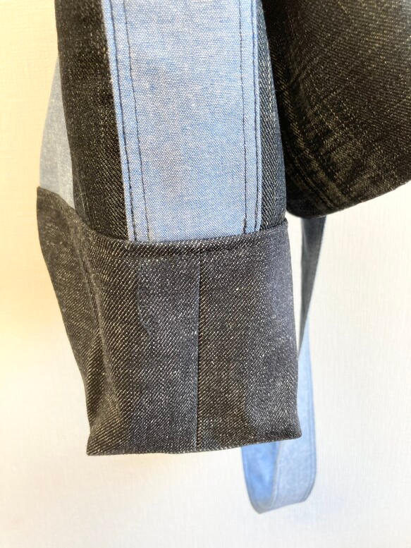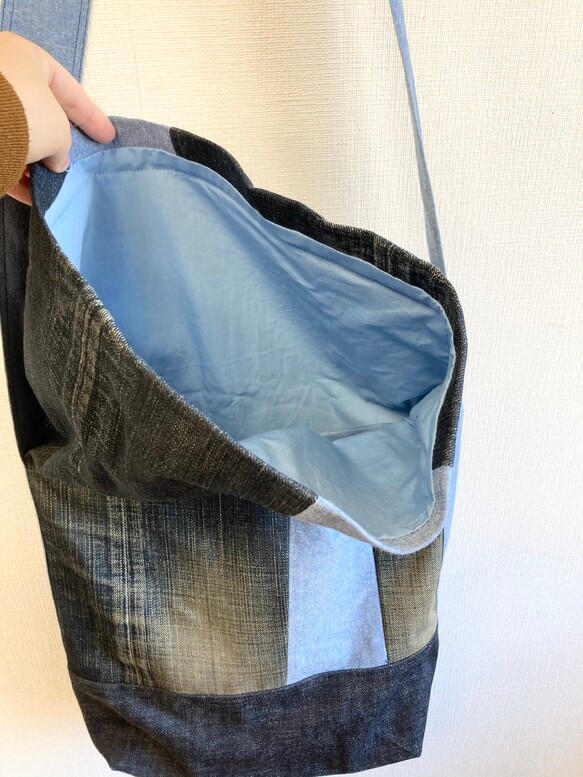 ベースはブルーの色褪せたデニム素材。フタの部分は水色とデニムの切り替えしの組み合わせ。どちらもコットンのしっかりとした素材です。裏地は水色の無地のコットン素材です。