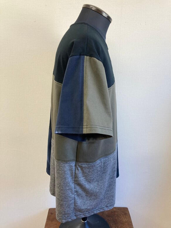 素材は薄手のコットン素材。サラリと着やすいストレッチカットソーだから着ていて楽チンです。デザインはベースはメンズの大きめTシャツで、肩が落ちるデザインで袖まわり、バスト周りはゆったりしています。組み合わせは無地の黒、紺、カーキ、グレーのバイカラー仕上げです。