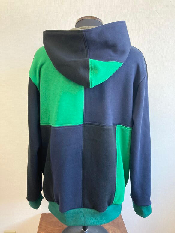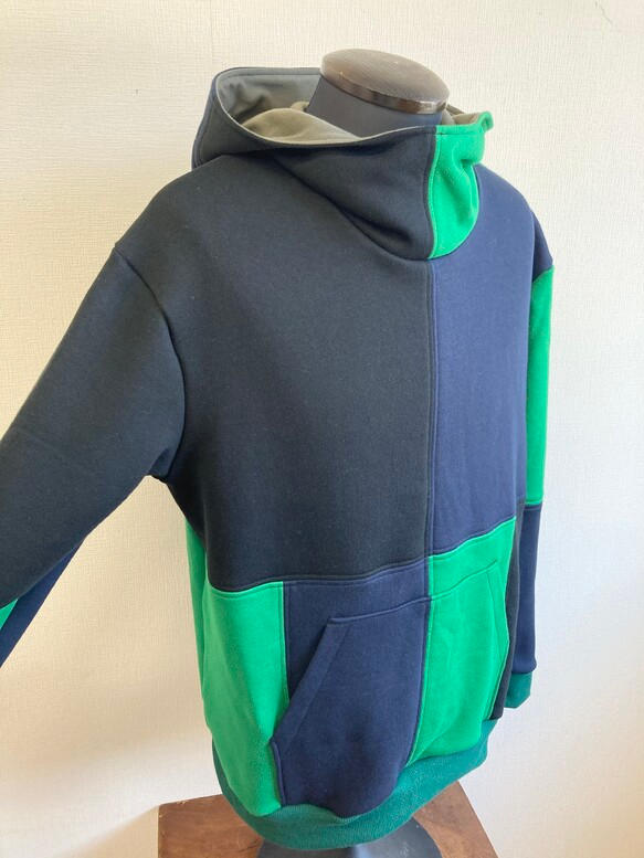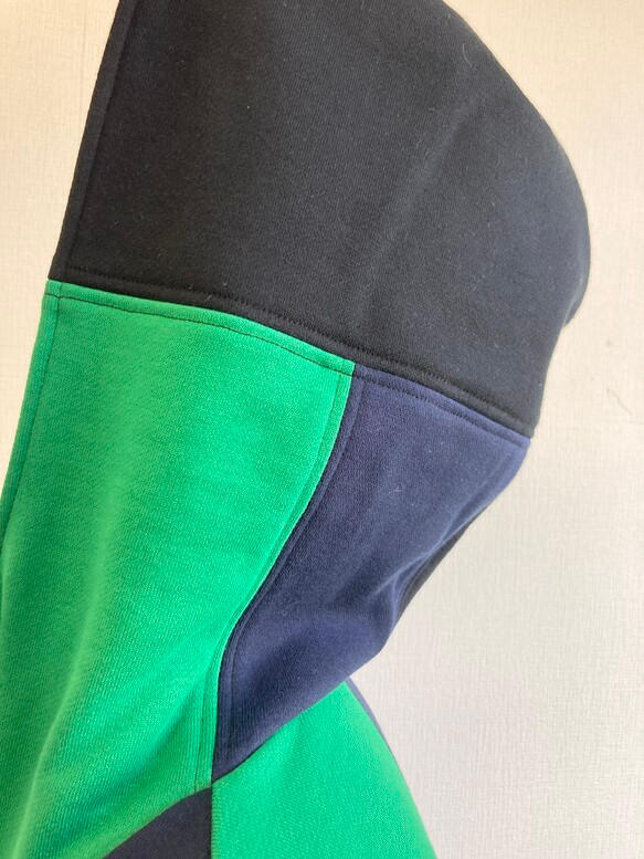 黒、紺色、グリーンのバイカラーで凝った組み合わせの継接ぎデザインになっています。普通のパーカーの3倍以上縫い時間かかるこだわりの仕上げです。