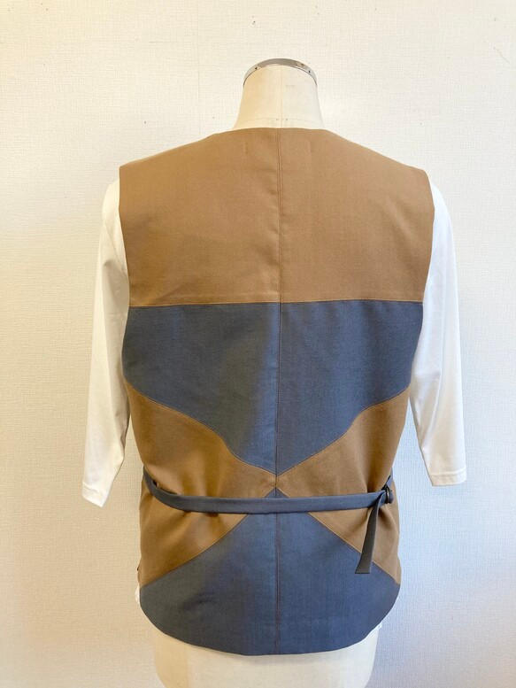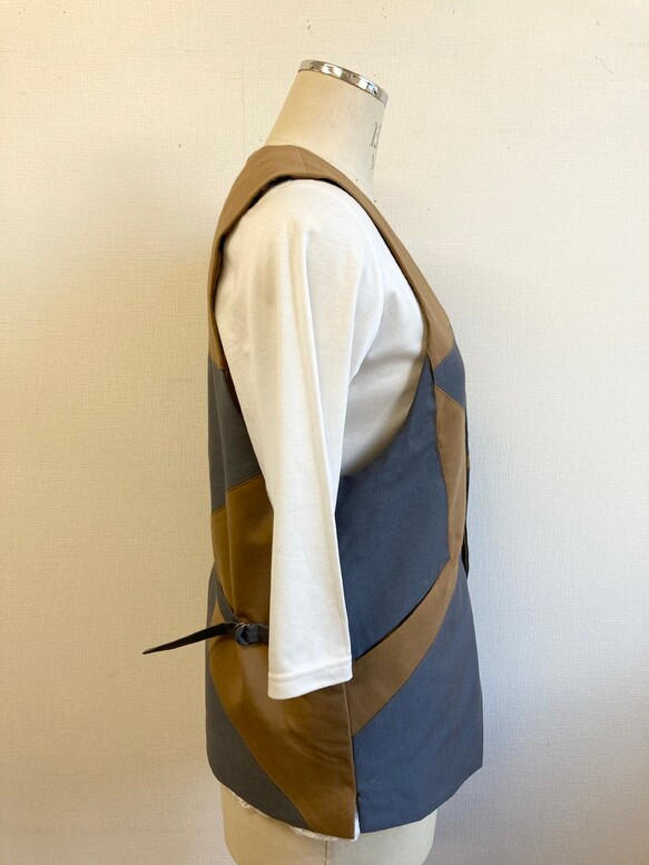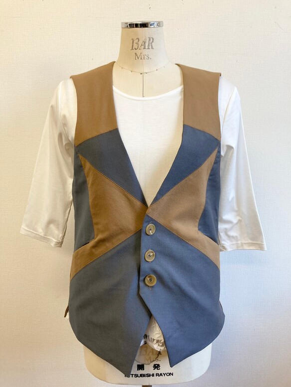 - バイカラーがオシャレな継きはぎのベスト。