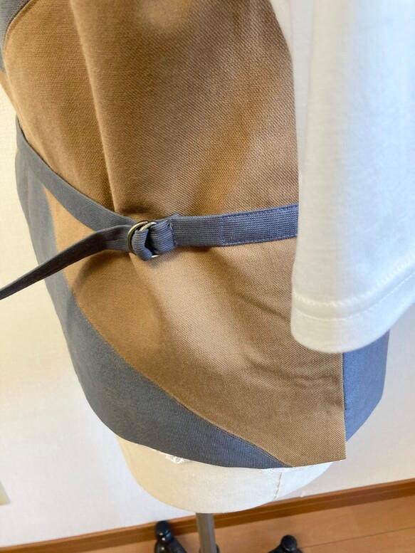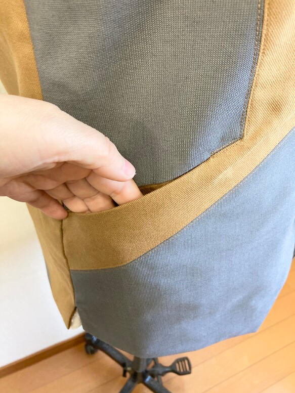 サラリとしたコットン素材で、キャメルとグレーの2色のバイカラーの組み合わせです。裏地がサテンのキャメルのポリエステル。軽くて重ね着しやすいと思います。