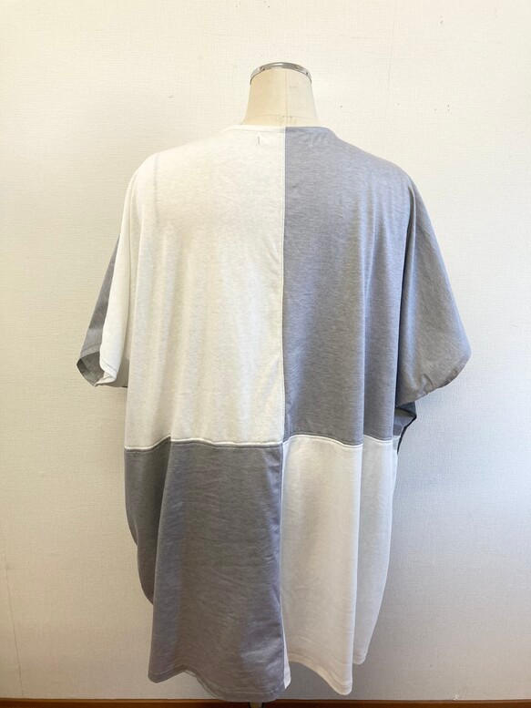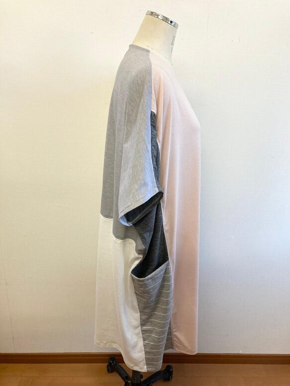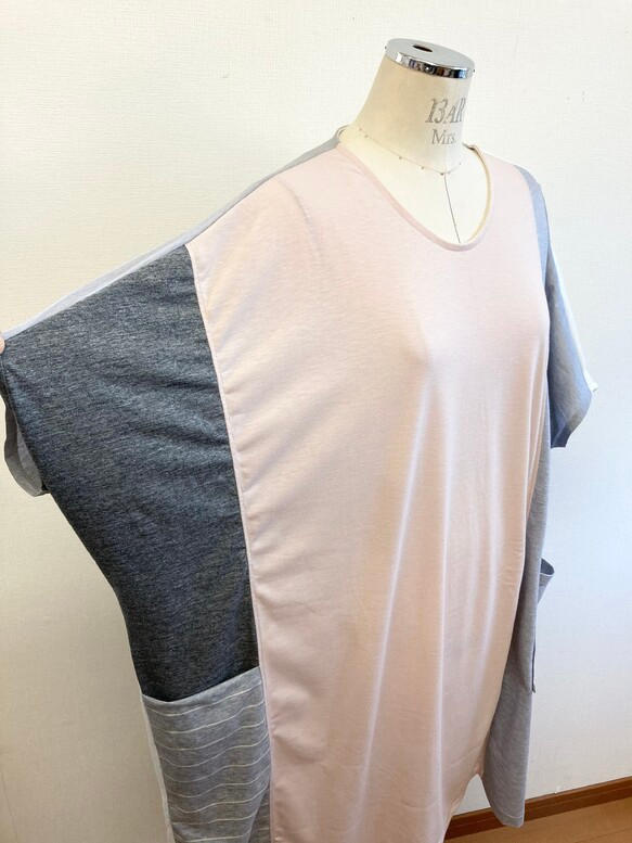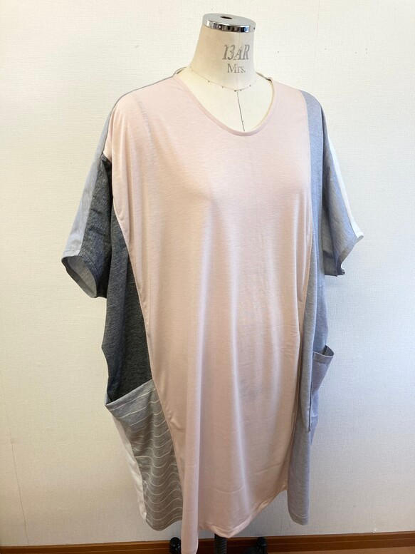 空を飛べそうな❤️ワイドバイカラービッグTシャツワンピース ピンクグレー白(サイズ L〜 L L )
