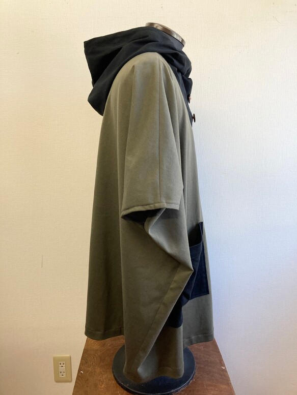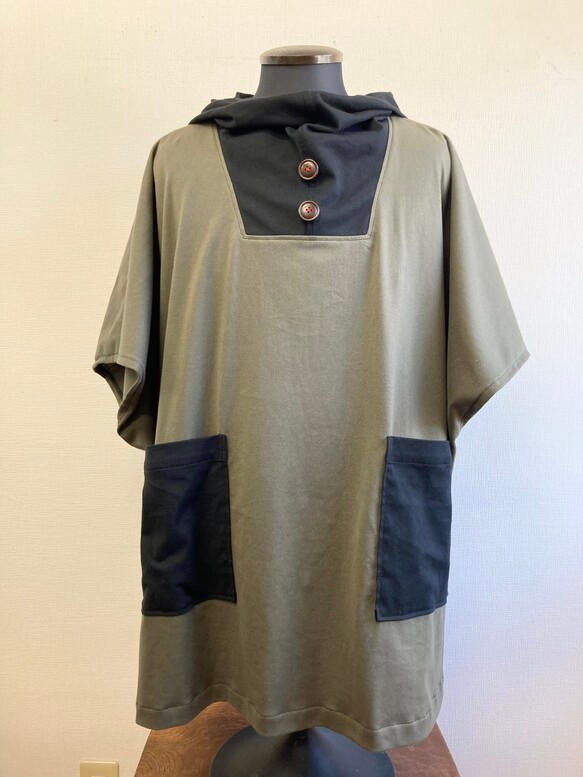 男女兼用❤️バイカラーポンチョ風五分袖パーカー カーキ黒(男女フリー L〜 L L)