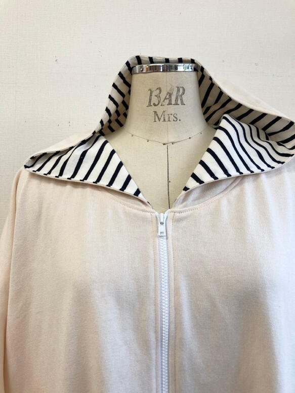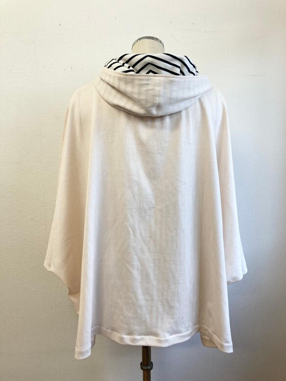 デザインはヨコ幅がかなりワイドで、肩と袖が一体化のドルマン型。フードもゆったり目で首の開きも大きめです。全体的にゆったりしていて着心地が楽チンで、軽やかにひらひら揺れるようなデザインです。
