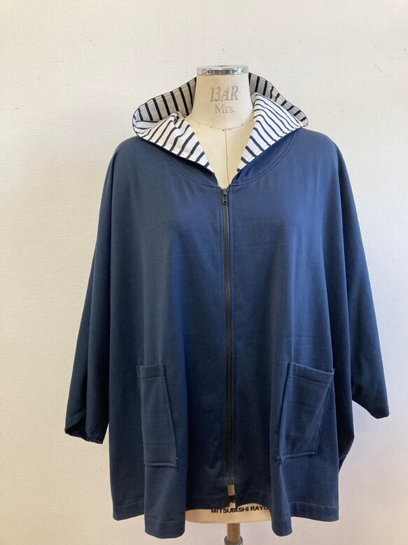 デザインはヨコ幅がかなりワイドで、肩と袖が一体化のドルマン型。フードもゆったり目で首の開きも大きめです。全体的にゆったりしていて着心地が楽チンで、軽やかにひらひら揺れるようなデザインです。