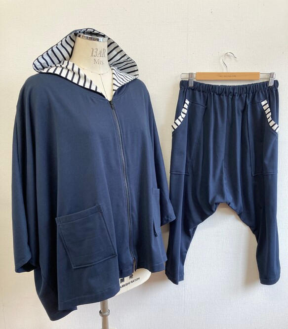 上下セット★モモンガみたいなドルマンパーカー&サルエルパンツ (紺)/男女フリーM~LまたはL~LL/受注生産