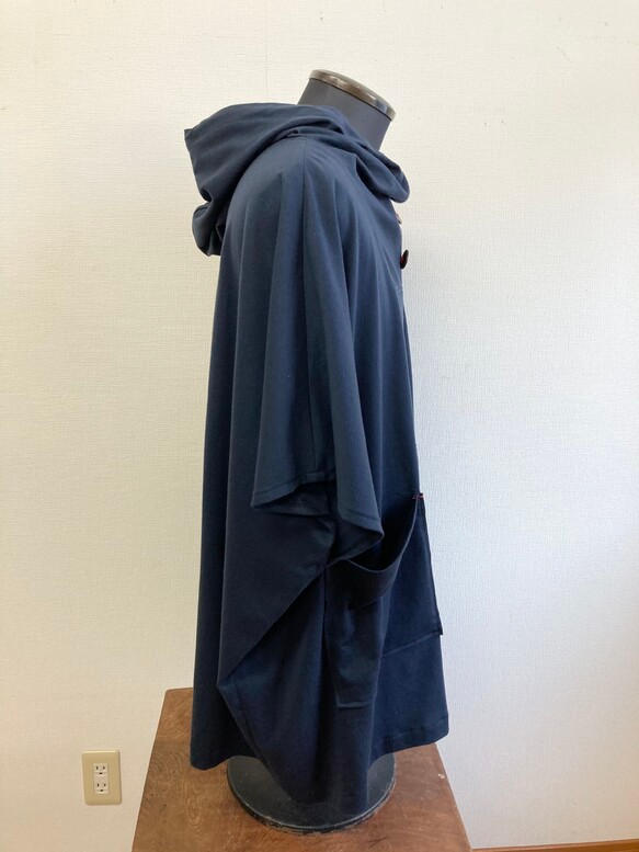 こちらの形はかなりビックサイズでゆったり、空が飛べそうなモモンガみたいなデザインです。ドルマン袖で肩が落ちるデザインになっているので、肩幅広い方でも着やすいです。首回りのフードは、襟がスタンドになっていて、首元でたぽっとするデザインです。そこに、大きめのボタンが付いていて、赤い縫い糸でポイントにして縫い付けてあります。また両サイドに大きなポケットが付いていて、こちらも赤ステッチ入りです。