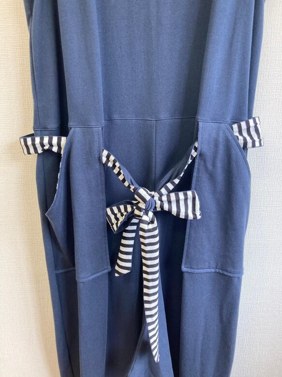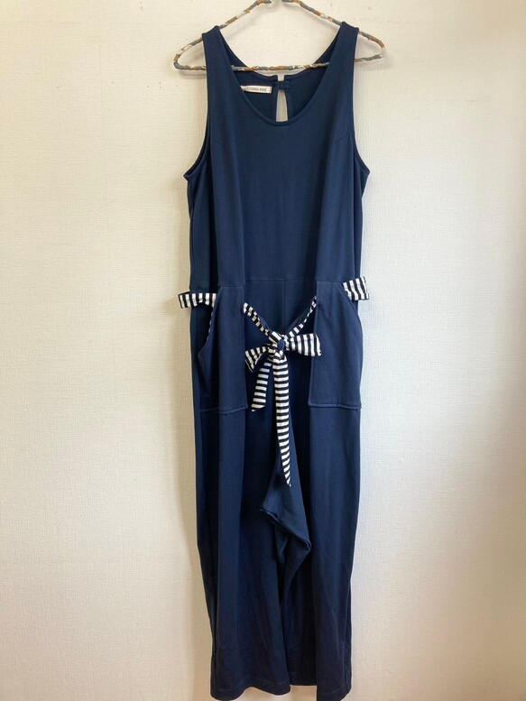 楽ちんサロペット❤️ボーダーリボン&ポケットのサルエルサロペットパンツ (紺)/サイズL~LL/受注制作