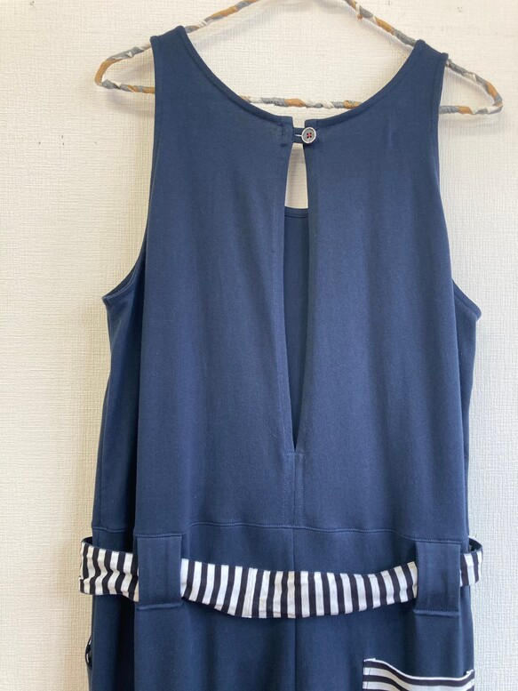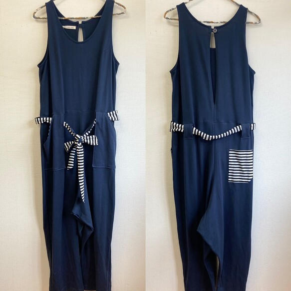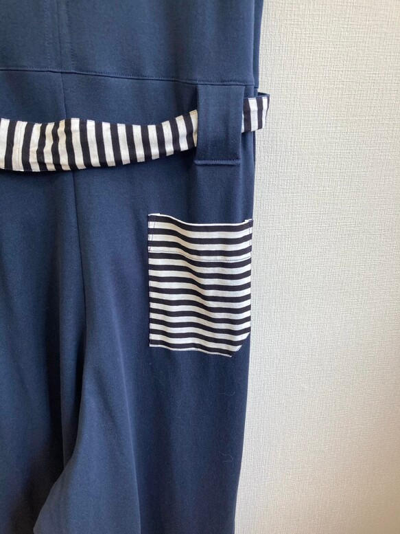 楽チンなサロペットでしかもお股がゆったりとしたサルエルパンツのめずらしいデザイン。素材はコットンのさらっとしたTシャツ素材で薄すぎず暑すぎない着心地のよい素材です。濃いめのネイビー無地と、白黒ボーダーの組み合わせ。
