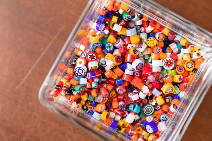 - 素材となる粒ガラスは、イタリアのヴェネチアにある世界遺産の島、ムラーノ島でしか作られていないミルフィオリというガラスを取り寄せ使用しています。