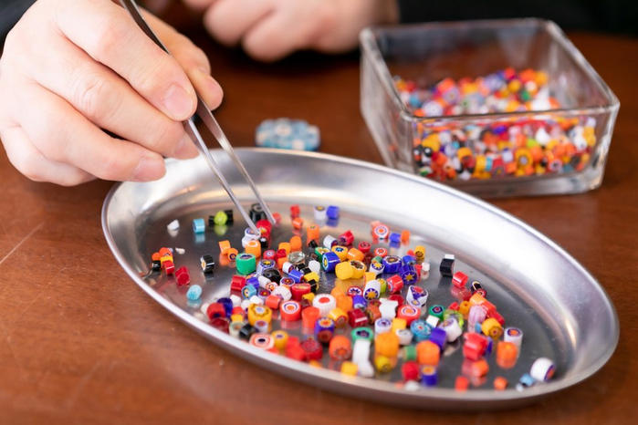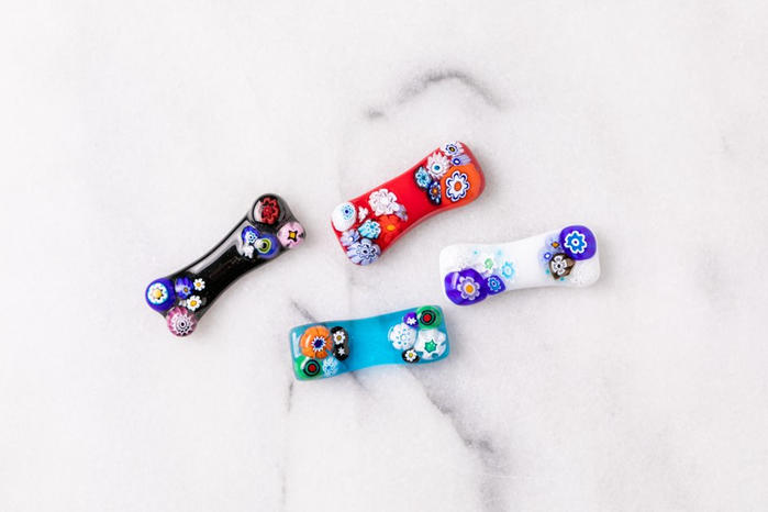 - 素材となる粒ガラスは、イタリアのヴェネチアにある世界遺産の島、ムラーノ島でしか作られていないミルフィオリというガラスを取り寄せ使用しています。