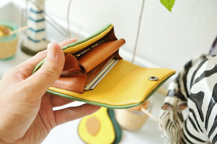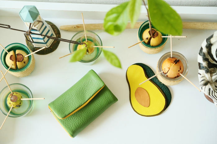 - まるでアボカドの実を切った断面のように、果実の色のグラデーションをぷっくりとしたシュリンクレザーで再現。マチ内装のヌメ革でも、「種」をちゃんと再現しています!アボカド好きにはたまらない、超個性的な革財布です☆