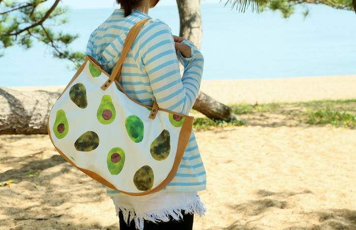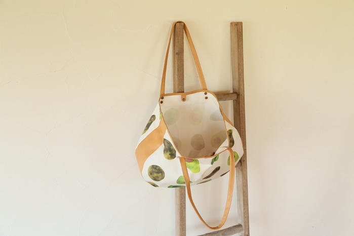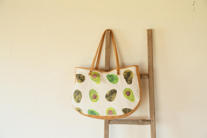 - atelier Rippleが今回のプロジェクトに合わせて製作した、総アボカド柄のキャンバス生地とナチュラルなヌメ革とを合わせたトートバッグ!!水彩画タッチで描かれたアボカドが何とも可愛い 個性派バッグとなりました。緩やかな曲線美びこだわり、丸みを帯びたフォルムが特徴。厚さ0.7ミリほどの薄手の牛ヌメ革で仕立てることで、驚きの柔らかさと、軽さを実現した、優しいトートバッグです。男女兼用でお使いいただけます
