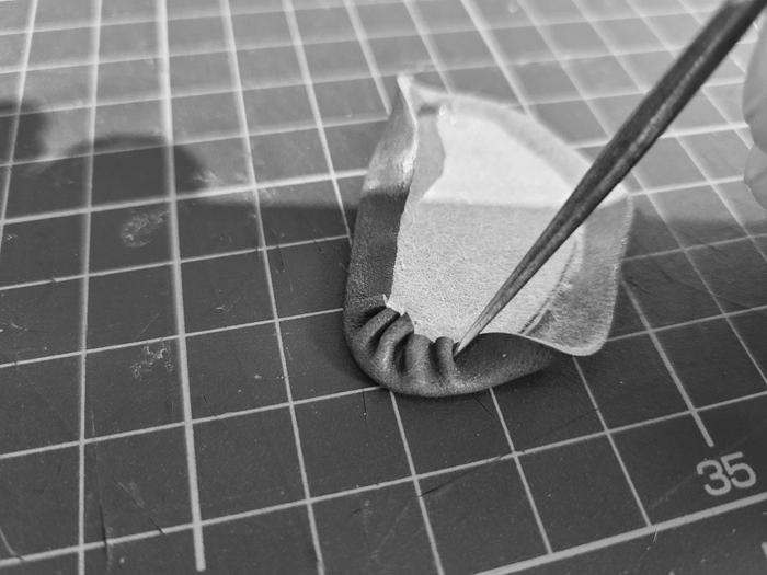 - その技術を応用し、部分的に薄くした牛革をパズルのようなパーツに仕立て、それらを3mmの縫い代で繋ぎ合わせていく。