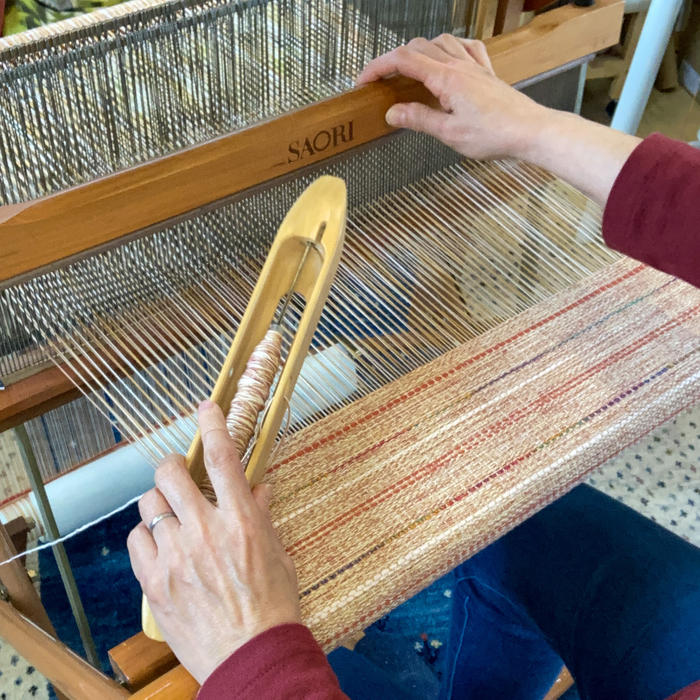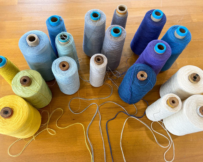 - 織りあがりをイメージして横糸を選び、シャトルに巻きつけて織っていきます。ひとつの色を出すのに大体3〜5本の糸を組み合わせます。自然の中にヒントを得て、派手すぎず、かと言って素朴になりすぎない、ナチュラルできれいな色の布にしたいと思って制作しています。