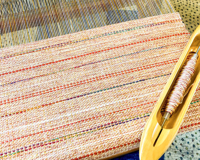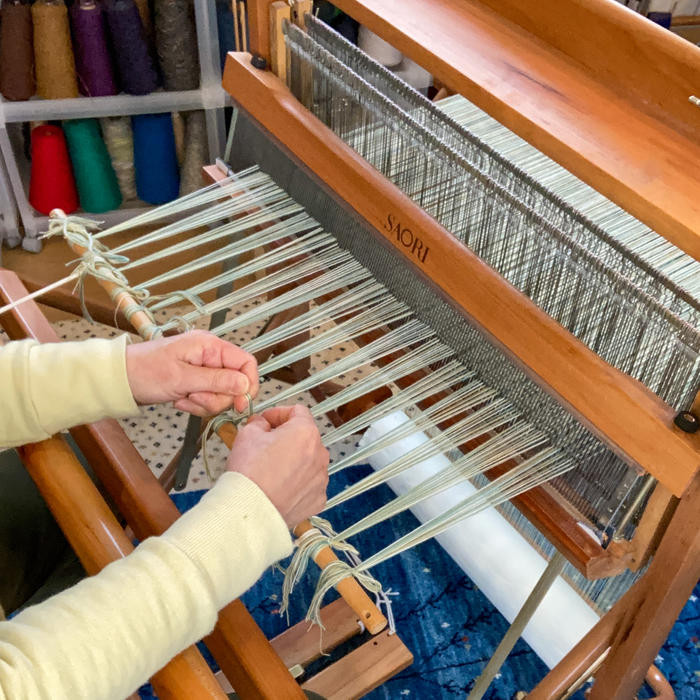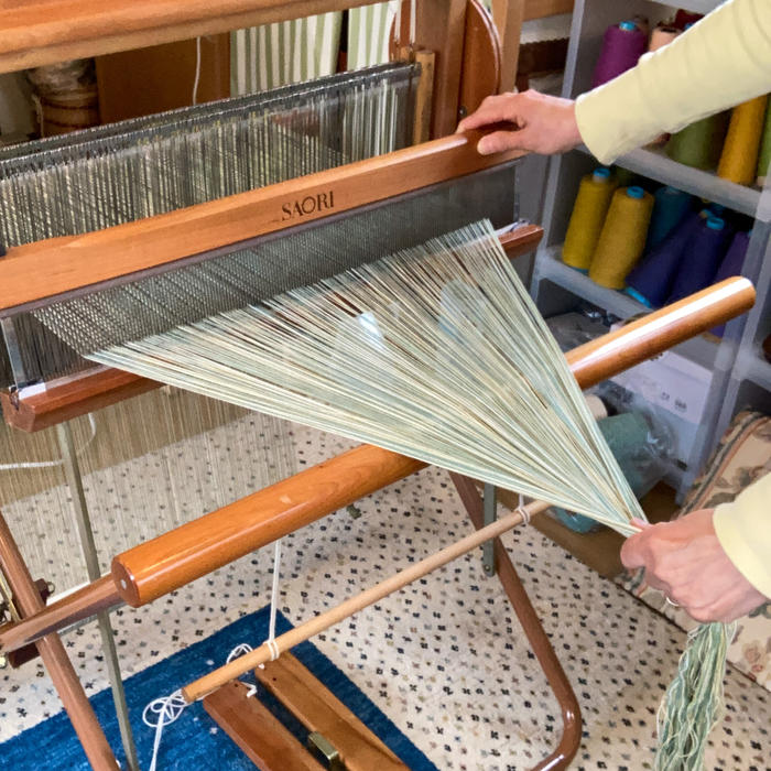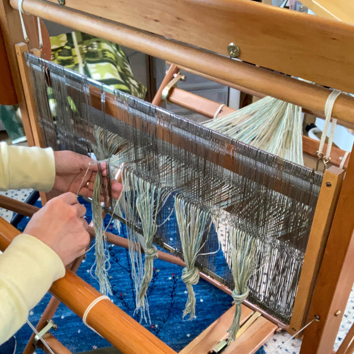 - 一枚の布を織るためには、必要な長さの縦糸を整経し、筬に糸を通し、綜絖に通し、ローラーにしっかりと巻き取ります。ここまでは結構地道な準備段階です。