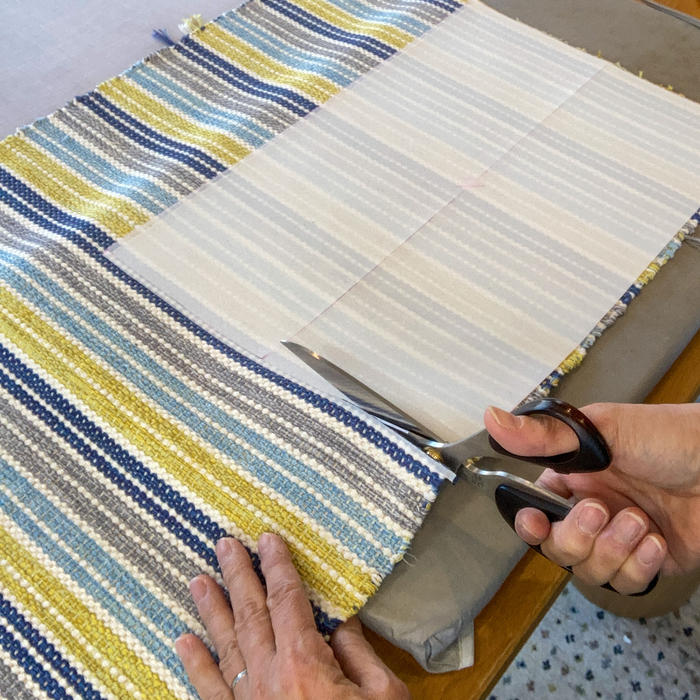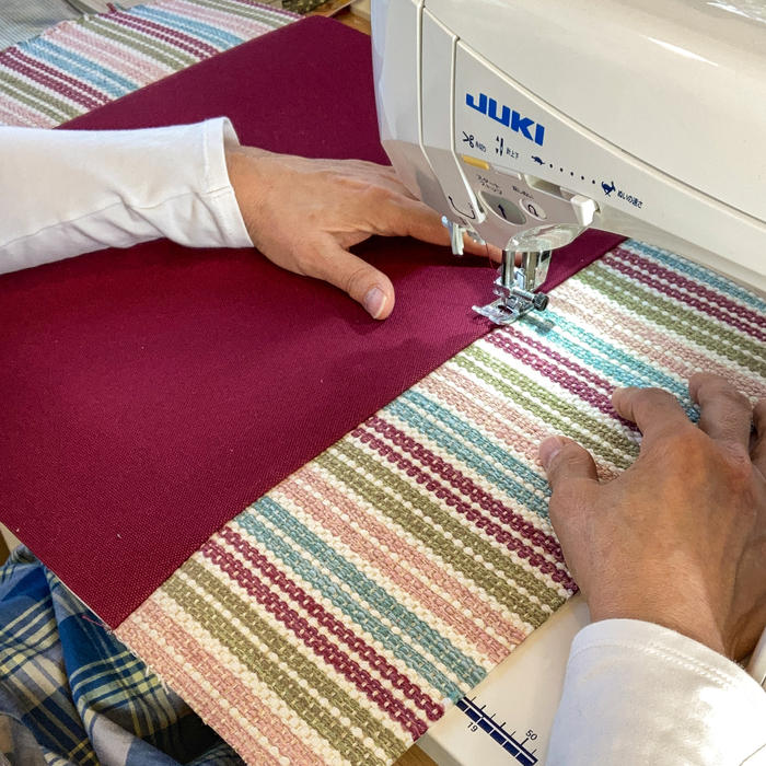 - 手織りの生地の裏にはハードな接着芯を貼り、裁断します。それぞれの布に合わせて選んだ色の丈夫な8号倉敷帆布を組み合わせることで、しっかりした自立するトートバッグやショルダーバッグに仕上げています。