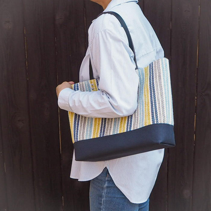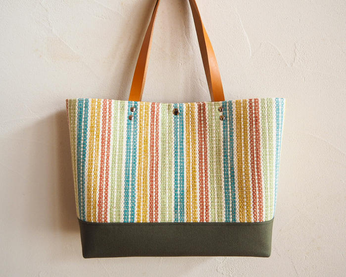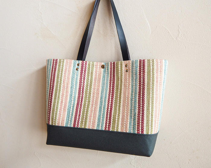 - 春のマルチボーダー柄の手織り布と帆布を半々に合わせたスッキリ横長型のトートバッグです。合わせる帆布の色でイメージも変わります。普段使いに、ちょっとしたお出かけ用バッグとして使い勝手の良いサイズです。