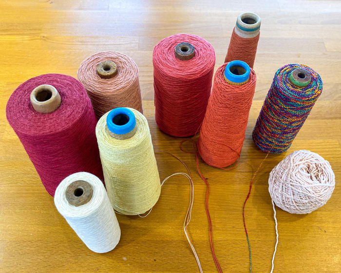 下の写真が実際に横糸に使った糸です。それぞれ織った状態がその下の写真です。