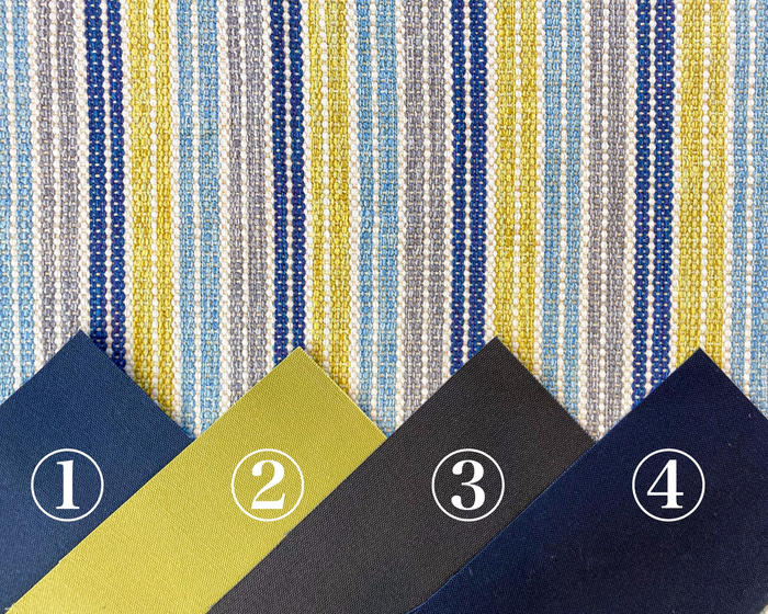 - 生成りのベースに、ネイビーブルー、マスタードイエロー、水色、ペールグレーのボーダーを配したさわやかな北欧風の色合いの生地です。