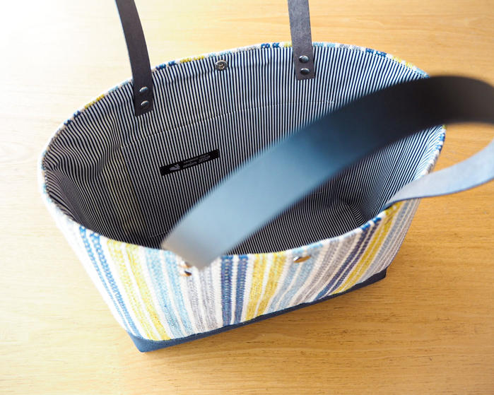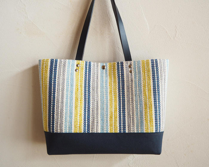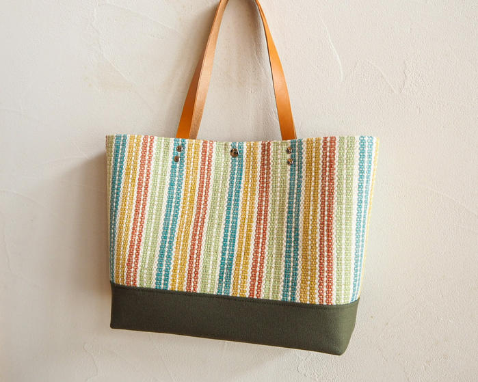 - 春色マルチボーダー柄の手織り布を縦使いにした大きめのショルダー兼用のトートバッグです。A4サイズも収納できる大きさで、通勤・通学やお稽古用バッグなど、お出かけバッグとしていろいろ使いやすいサイズです。