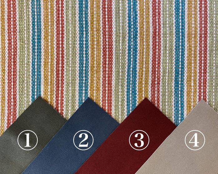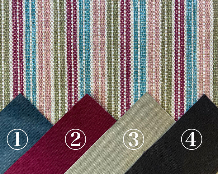 「購入する」ボタンを押した後の画面で手織り布の色と、それに合わせる帆布の色を選択してください。(選択肢は色番号で表示されますので、対応する色名はこちらでご確認の上ご購入ください。)ただし、ご提供のタイミングにより、帆布の色はお任せ(見本と同じ)となる場合がありますので、ご了承ください。