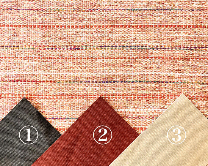 - オレンジ色、イエロー、ピンク、生成り色の糸をミックスしたピーチオレンジのツイード調ベースに、変化のある糸をアクセントに織り込んであります。オレンジシャーベットのようなイメージです。