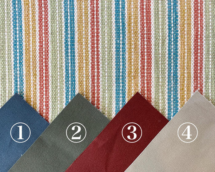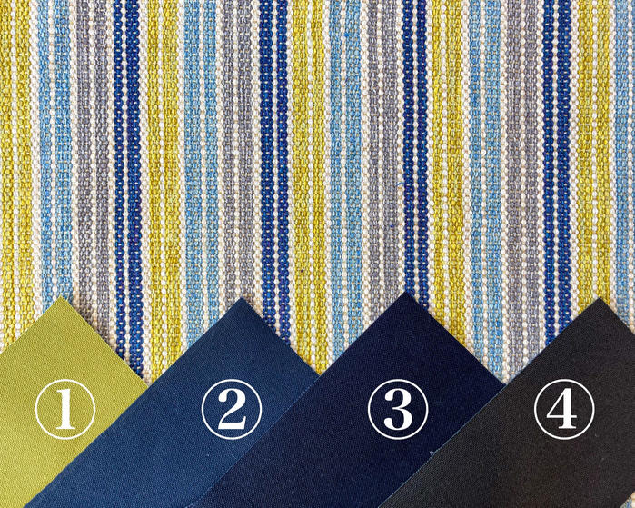 「購入する」ボタンを押した後の画面で手織り布の色と、それに合わせる帆布の色を選択してください。(選択肢は色番号で表示されますので、対応する色名はこちらでご確認の上ご購入ください。)ただし、ご提供のタイミングにより、帆布の色はお任せ(見本と同じ)となる場合がありますので、ご了承ください。