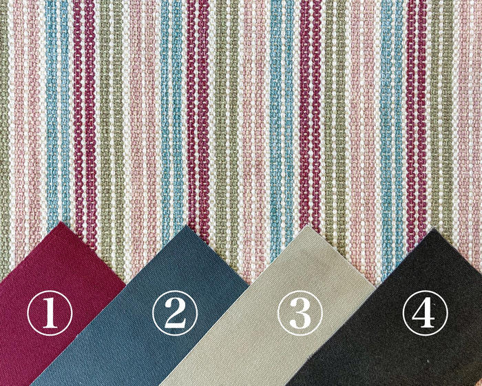 - 春の庭をイメージして、生成りのベースに、ローズピンク、モスグリーン、スモーキーピンク、ブルーグリーンのボーダーを配したきれいな落ち着いた色合いの生地です。