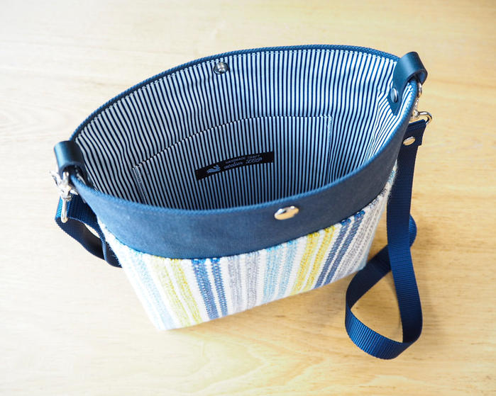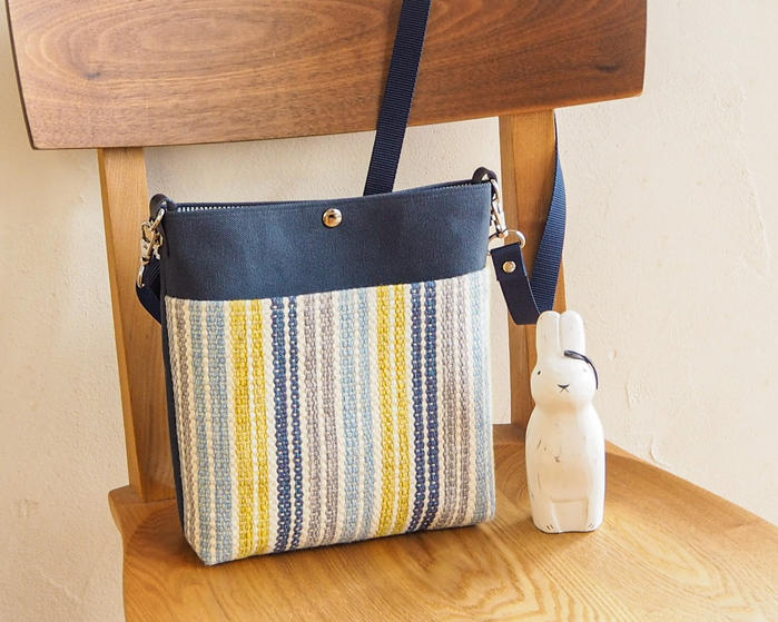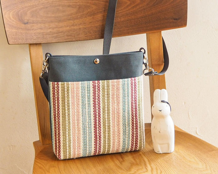 - 春のマルチボーダー柄の手織り布を使ったミニショルダーバッグ(マチ付きサコッシュ)です。大きなポケット付きで、お散歩用やサブバッグとしても手軽に使えるデザインです。