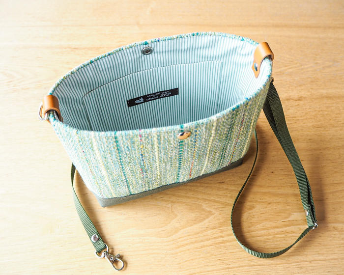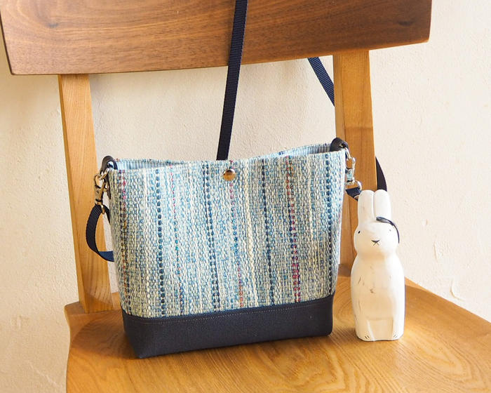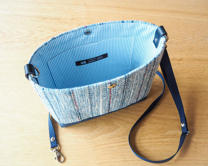 - 合わせる帆布の色はスモーキーブルー、内布はサックスブルーのストライプ柄の生地を使用。