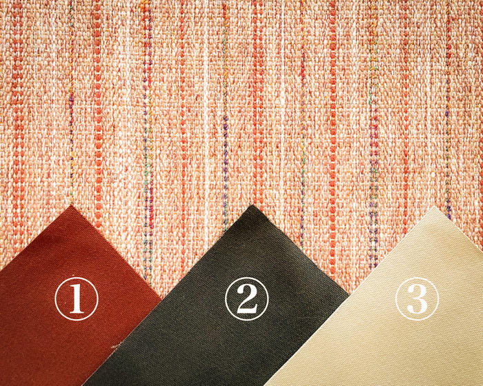 - オレンジ色、イエロー、ピンク、生成り色の糸をミックスしたピーチオレンジのツイード調ベースに、変化のある糸をアクセントに織り込んであります。オレンジシャーベットのようなイメージです。