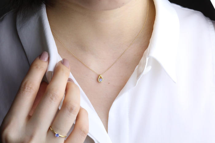 - ティアドロップ(しずく)型のフレームに、ファセットカットの天然石をセットしました。