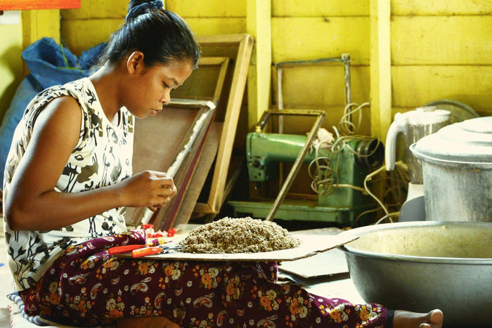 手漉き紙は破棄されてしまうバナナの幹の繊維を利用して作られています。