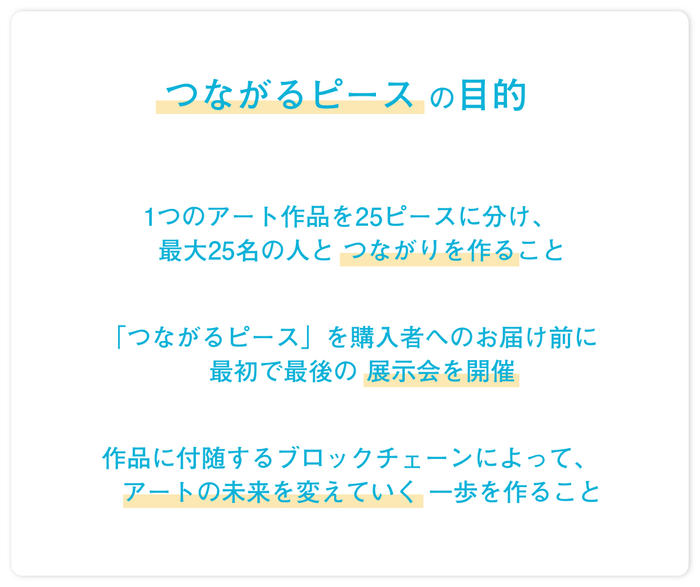 絵を気に入っていただけたり、僕の想いに共感・共鳴していただいた方と、最大25名の方々に1ピースずつ所有していただき、作品を通して人とのつながりを感じてもらうことができれば良いと思っています。